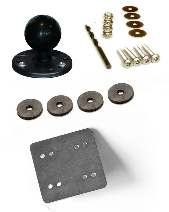 The Surfpole's base kit includes an aluminum backing plate and four SBR rubber pads to cushion the backing plate from direct contact with the kayak deck.